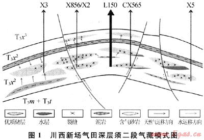 上三疊統(tǒng)須家河組氣藏是目前四川盆地西部(以下簡(jiǎn)稱川西)坳陷深層天然氣勘探熱點(diǎn),亦是儲(chǔ)產(chǎn)量增長(zhǎng)的主要層段,其主力氣藏為須家河組須二段氣藏。2000年,在川西新場(chǎng)氣田須二段中部T3x24(4砂組)儲(chǔ)層成功鉆獲無(wú)阻流量151.4×104m3/d、穩(wěn)定產(chǎn)量38×104m3/d的高產(chǎn)工業(yè)氣井——X851井,展現(xiàn)了川西坳陷中段深層致密碎屑巖氣藏巨大的勘探潛力。但氣藏的勘探開發(fā)難度極大,其后在同一構(gòu)造帶上部署的CX560、CX565、CL562、L150井等多口深井效果并、不理想且產(chǎn)能差異極大,主要原因?yàn)閮?chǔ)層為典型致密碎屑巖儲(chǔ)層,受裂縫網(wǎng)絡(luò)分布影響,氣藏非均質(zhì)性極強(qiáng)[1~2]