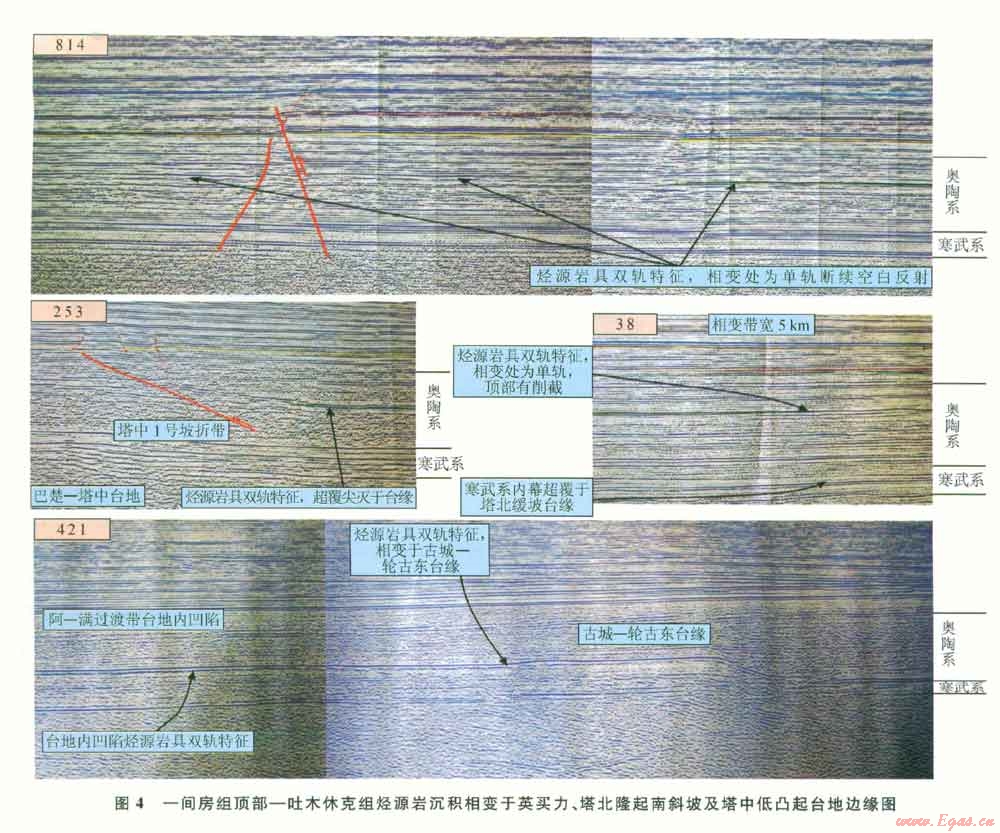 但是,通過對經過羊屋2井地震剖面(測線419)的精細分析(圖3),發(fā)現在羊屋2井南部3 km處存在同相軸Tg5-1及其下面的“雙軌”變“單軌”的巖性相變反射,即代表著上奧陶統良里塔格組石灰?guī)r頂面Tg5-1之下的強反射軸發(fā)生相變。同時經多條地震剖面相互閉合、連接確認,此發(fā)生相變的“雙軌”同相軸與過塔中29井烴源巖發(fā)育位置的強相位反射顯示的是同一套地層發(fā)射。據此認為,中上奧陶統一間房組頂部—吐木休克組烴源巖沉積相變于塔北隆起南斜坡羊屋2井南3 km處的碳酸鹽巖臺地內緩坡。