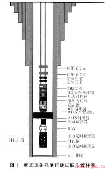 超正壓射孔酸壓測試管柱如圖1所示,主要用于射孔后立即進(jìn)行改造的儲層,一般是儲層物性較好、通過改造可獲得理想產(chǎn)能的儲層。充分利用超正壓射孔產(chǎn)生的高壓聚能流體對地層形成的微裂縫,降低注酸初始壓力。該三聯(lián)作工藝,不僅能縮短施工周期、成果見效快、有效降低測試成本,而且能減少射孔后壓井液對地層的二次污染。
