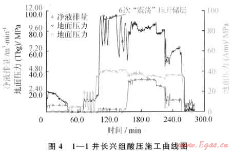 針對元壩氣田區(qū)塊儲層埋藏深、破裂壓力梯度較高的特點(diǎn),通過在注入前置酸之前采用高密度(1.8~2.0g/cm3)加重酸液來提高液柱壓力,實現(xiàn)在井口施工限壓下增加井底凈壓力,以增大壓開儲層的幾率。1-1井采用密度1.8g/cm3加重酸,創(chuàng)造了井底壓力最高(212MPa)的液體加重最高的世界紀(jì)錄。