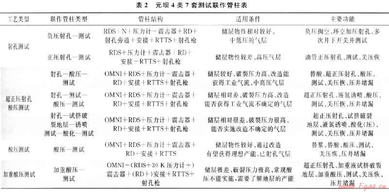 利用地震、鉆井、錄井、測井等資料,在研究區(qū)域構(gòu)造、砂體展布、地層壓力及溫度、含油氣情況、儲層特征等基礎(chǔ)上,針對不同的測試目的,形成了以“超正壓射孔酸壓測試技術(shù)”[4]為核心的4類7套優(yōu)快APR測試技術(shù)(表2)。對深度大于6000m的氣井,改造管柱需增加2組伸縮短節(jié)。