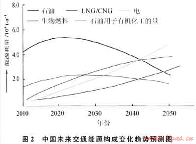 在向低碳能源轉(zhuǎn)型的歷史時期,目前還占世界一次能源消費首位(35%)、主要用于交通燃料的石油大部分將在2050年被其他低碳清潔能源所替代。圖2是中國未來交通能源構(gòu)成變化趨勢預(yù)測圖。事實上,2011年3月21日歐盟委員會已向歐洲議會提出了“2050年禁止使用汽柴油車,2030年汽柴油車使用減半”的法案。IEA估計生物燃料將于2040年成為主力航空燃料,到2050年其應(yīng)用將占全球運輸業(yè)的25%。國際天然氣汽車協(xié)會預(yù)計世界天然氣交通工具將以年增17.8%的速度增長,到2020年將達6500萬輛,約為2005年汽車總量的9%。隨著科技進步的加速,上述轉(zhuǎn)型的進程很可能還將加快。
