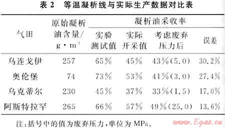 俄羅斯的烏連戈伊、奧倫堡、烏克蒂爾、阿斯特拉罕等凝析氣田比較的結(jié)果值得重視,飽和的油環(huán)凝析氣藏差別很大,不飽和的差別要小些,分析原因有[4]:①測(cè)等溫凝析線時(shí)放棄速度過(guò)快會(huì)造成油氣相態(tài)不平衡,從而帶來(lái)測(cè)試誤差;②多孔介質(zhì)的存在使采出凝析油量減少;③地層水(含凝析水)對(duì)相態(tài)的影響,一般影響較??;④凝析氣層中剩余原油飽和度的影響,一般影響較大。其對(duì)比結(jié)果見(jiàn)表2。