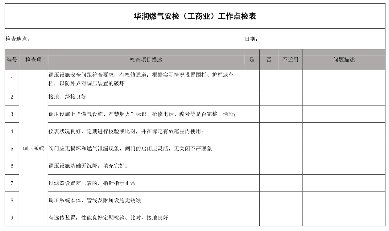 3 調(diào)壓設(shè)施上“燃?xì)庠O(shè)施、 嚴(yán)禁煙火” 標(biāo)識、 搶修電話、 編號等是否完整、 清晰;