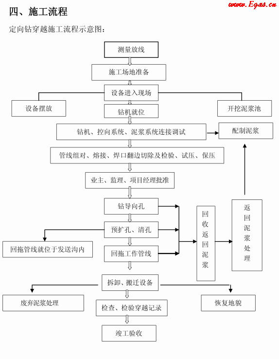**河水面寬度約***m,采用水平定向鉆穿越1孔中100mm導向孔,擴孔至500mm導向孔,然后清孔一次,回拉已試壓完成的DeXX燃氣管道,穿越長度約180m,擬采用ZT-18型水平鉆機進行施工,預計施工***天。